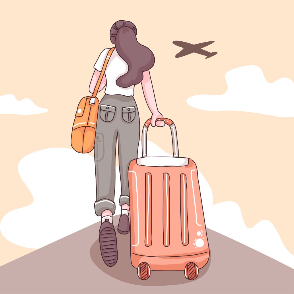 The back of a female tourist long hair dragging a suitcase, airplan and cloud on sky in cartoon character, flat vector illustration